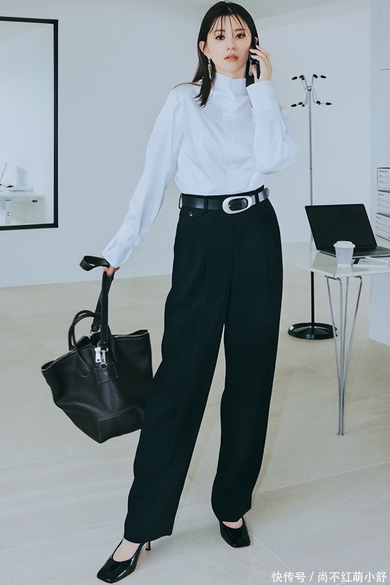 look1)黑色厚材质裤子 x 立领衬衫 x 皮带:不得不说用腰带点缀的厚材质裤子堪称酷感十足,紧身设计的皮带扣让造型更整洁,再通过平衡宽松裤型,展现精致女性气质,值得大胆尝试。